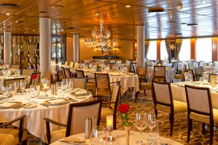 Windstar offers an open seating program allowing guests to dine when and with whom they like. Light and vegetarian cuisine available on request.