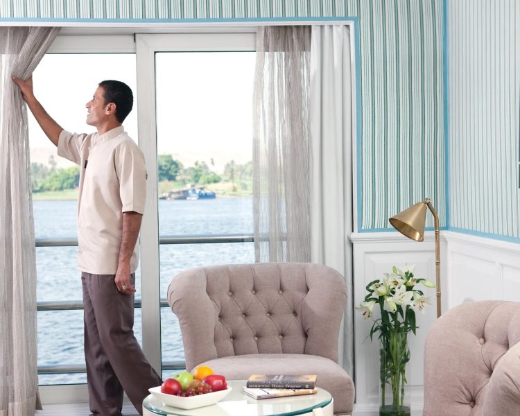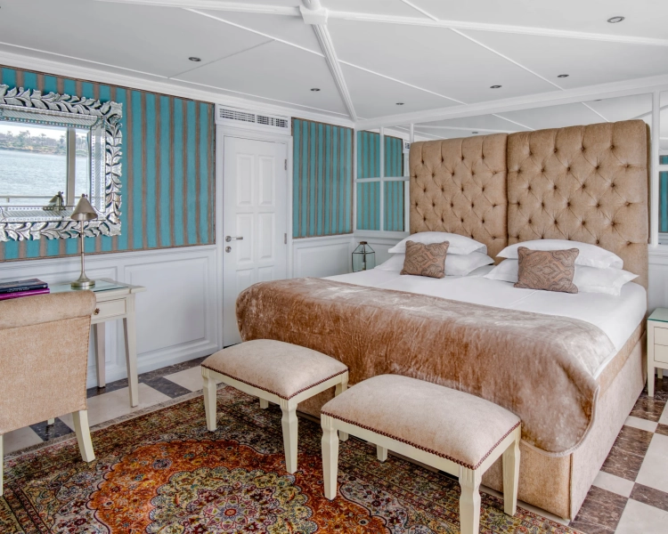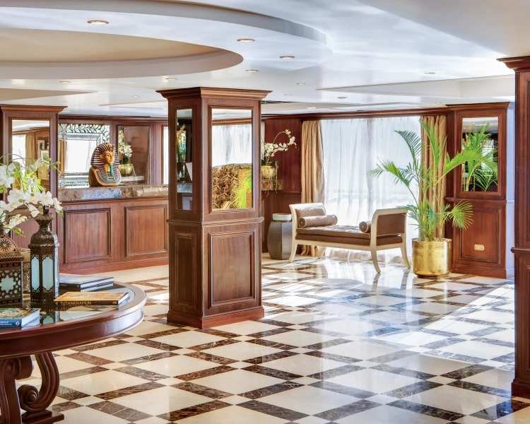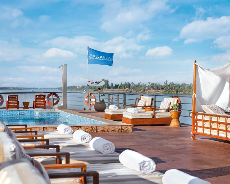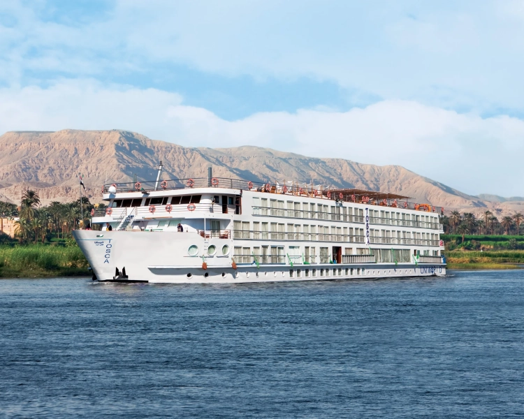 The River Tosca perfectly captures the warmth and style of Egypt, taking guests on a culturally enriching adventure down the Nile in absolute luxury. This all-suite ship is elegantly designed with wood finishes and cozy public spaces. From the sprawling Sun Deck with shaded cabanas and a swimming pool, to the stylish lounge decorated with local wares, every space is inspired by the region in which it sails. Comfortable suites are fitted with the finest locally made products—like Egyptian cotton linens, for example. With a maximum capacity of 82 guests and a staff to guest ratio of almost 1:1, a cruise on the River Tosca is about as intimate and indulgent as it gets.
